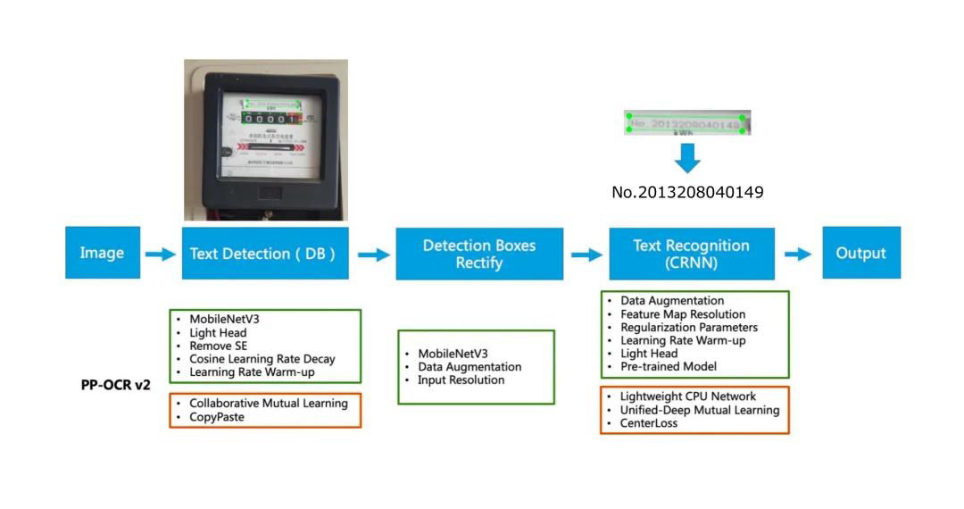 基于上述难点,飞桨开发者技术专家不断进行尝试,最终选用了飞桨文字识别套件 PaddleOCR 中的 PP-OCR 模型进行了微调与优化,其检测部分基于 DB 的分割方法实现,直接解决了电表数据中的倾斜问题,通过再造数据集来扩充识别数据集,训练识别模型。PP-OCR 模型经过大量实验,其泛化性也足以支撑复杂垂类场景下的效果。