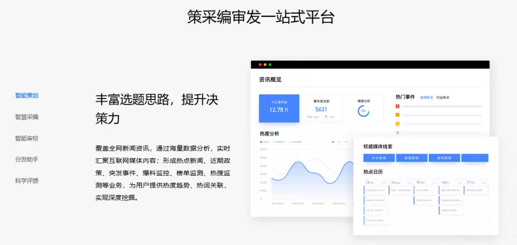 本次升级从媒体内容生产的“策采编审发”全流程角度,推出智能策划、智慧采编、智能审校、分发助手、科学评馈五大场景功能模块,为媒体工作者提供一站式、开箱即用的内容生产服务和工具,帮助媒体机构全面提升内容生产效率,助力开启智能媒体新时代。亮点功能有新闻线索、热点发现、图文转视频、AI 声优机器人等。