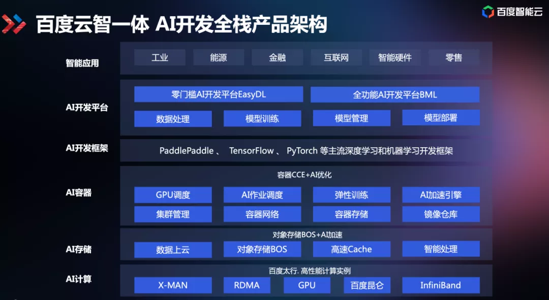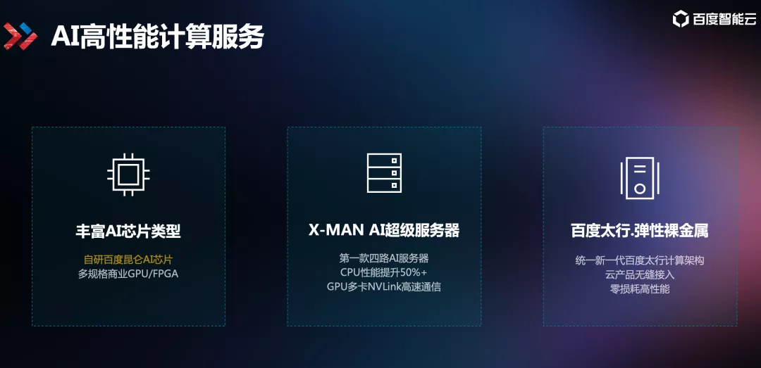 当下,智能家居、智能金融、自动驾驶、智慧医疗、智能零售、智能制造等领域的行业应用正全面进入 AI 原生阶段。为了更好地适应已经来到的 AI 原生新阶段,百度智能云构建全栈的 AI 原生云架构,面向 AI 应用场景进行深度的软硬一体协同优化,构建业界最适合跑 AI 的云,在 AI 基础设施层面能够为企业提供高性能的 AI 算力,更简单、易用、高效的开发过程,更流畅的端到端应用开发全流程体验。 百度智能云主要通过 AI 计算、AI 存储、AI 容器三层构建 AI 开发基础设施。具体来看: 基于百度“太行”弹性裸金属产品为客户提供高性能,多规格高性价比的算力服务。这里分为如下几个维度分别介绍: