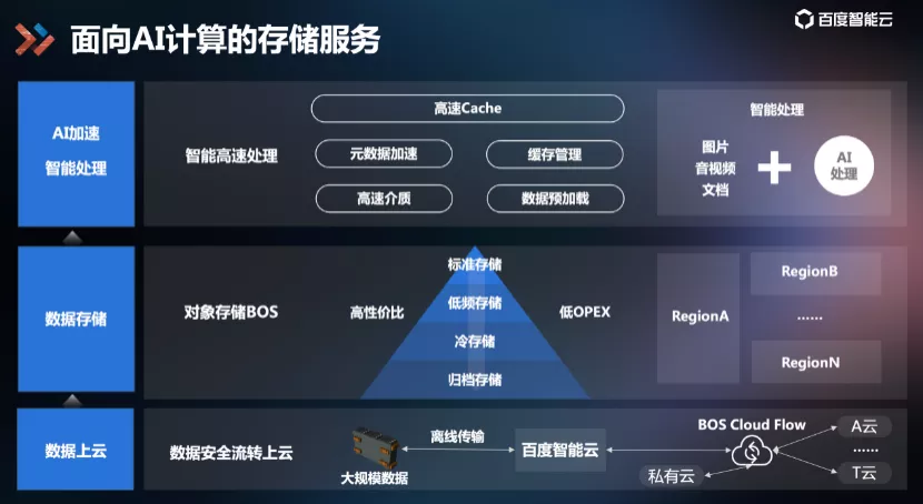 - 第二层,是数据存储,百度以对象存储为核心提供高性价比的存储服务。百度对象存储提供业界最先的4级数据存储,并提供智能的生命周期管理和业界领先的读写性能,满足客户在大数据场景下的性价比需求。