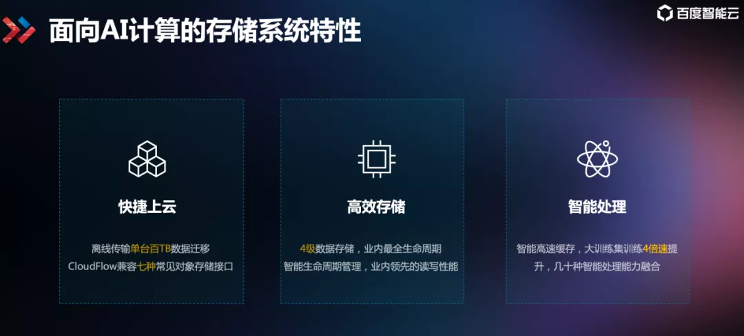 - 第三层,就是数据的处理和 AI 加速层,在加速层面,百度提供一层 Cache 服务,基于更高速的存储介质,提供元数据加速,缓存的管理等能力,以提供更高性能的存储能力,同时也在对象存储上默认集成了一些 AI 智能处理能力。百度的高速缓存能力,在一些场景下训练速度能提升4倍以上,同时也融合集成了几十种智能处理能力。