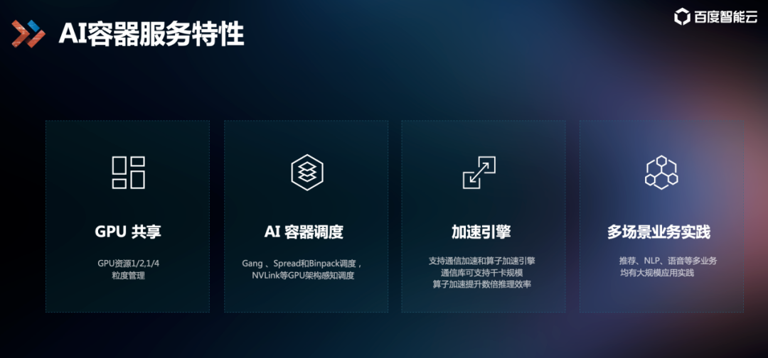 百度智能云的容器引擎服务 CCE,提供基础的 Docker 容器生命周期管理、大规模容器集群运维管理、业务应用一键式发布运行等功能,还面向 AI 场景进行了一系列的针对优化,包括 GPU 异构资源的管理,AI 作业的调度管理等,以更高效的使用算力资源,提升资源自用使用率。具体介绍一下 AI 容器服务的一些关键特性: