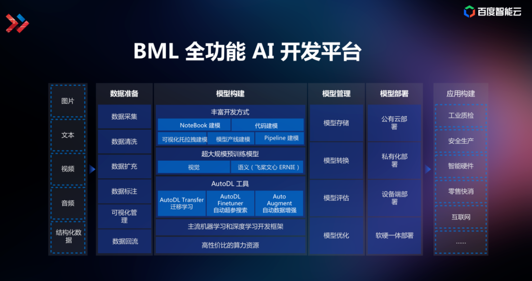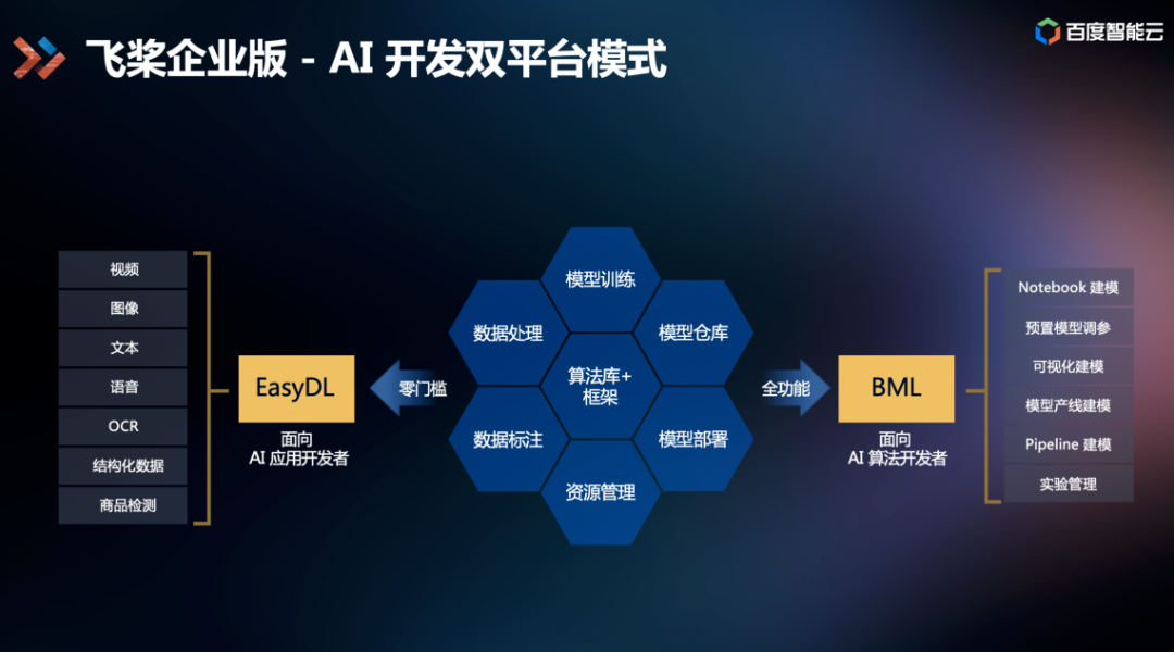 伴随着产业智能化的大潮,AI 已成为诸多行业转型升级的通用技术,企业级 AI 开发平台的作用日益凸显。依托 AI 原生的云基础设施,基于百度自研的产业级开源深度学习平台飞桨,满足企业针对场景的定制化应用需求,百度推出飞桨企业版,包括面向 AI 应用开发者打造的零门槛 AI 开发平台 EasyDL 和面向 AI 算法开发者建设的全功能 AI 开发平台 BML。