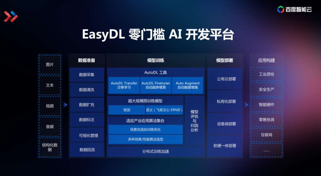 EasyDL 面向 AI 应用开发者,支持图像、文本、视频、语音、OCR、结构化数据、零售行业版7大技术方向,16种任务类型,支持公有云、本地服务部署、设备端、软硬一体四种部署方案,已服务超过80万用户。从 EasyData 智能数据服务、模型训练到服务部署一站式全流程服务让用户无需了解算法细节,5分钟即可上手,最快10分钟完成模型训练。