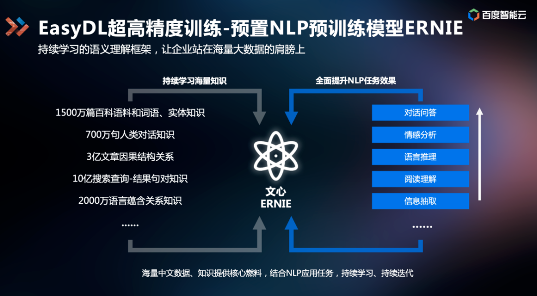 - 飞桨文心 ERNIE 开发套件。飞桨的可持续学习语义学习模型,除此之外还提供30+算法工具,20+细化的预训练模型,20+数据处理的工具和20+基础开发的工具,使整个数据标注投入的算法、开发时长都有大幅度降低,效率大幅度提升。
