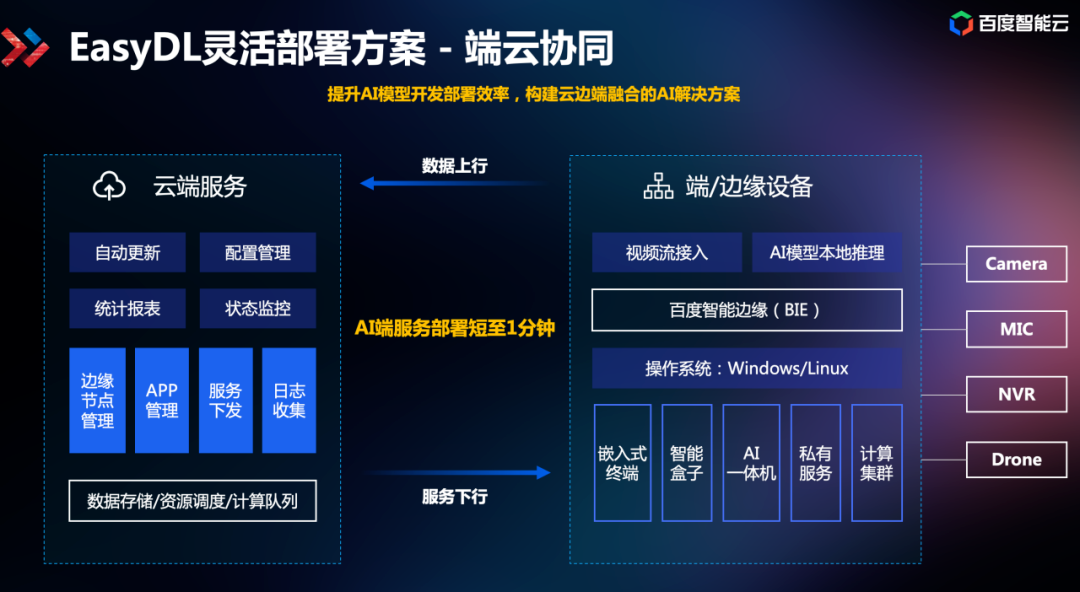 - EasyDL 端云协同的部署方案可以运行在各式各样的智能终端,如盒子、一体机、服务器之中,在这些边缘设备上,可以再接入各式传感器(如摄像机、MIC)。