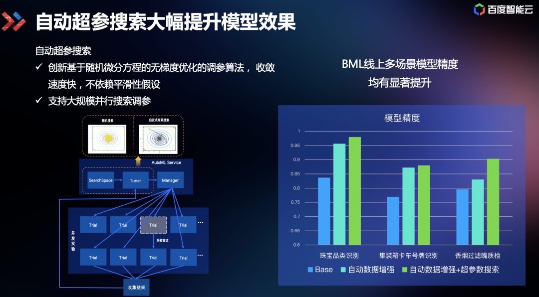 BML 提供预置模型调参、Notebook、自定义作业、可视化建模等多种建模方式。其中,预置模型调参在实现了低代码建模的基础上,具备一定的脚本编辑灵活性,同时内置了自动超参搜索功能助力提升模型效果。BML 提供的自动超参搜索功能是创新基于随机微分方程的无梯度优化的调参算法,收敛速度快,不依赖平滑性假设,并且可以支持大规模的并行搜索调参。在开启自动超参搜索之后,BML 线上多场景的模型精度平均可提升10%以上。