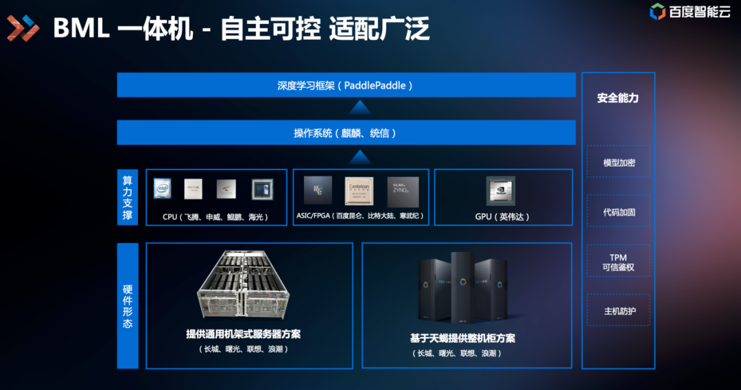 BML 全面支持从国产深度学习框架飞桨,到麒麟等国产操作系统,再到国产 CPU 和 GPU 以及长城、曙光、联想、浪潮推出的各类硬件形态,构成了自主可控、适配广泛的 BML 一体机,高性价比的算力资源满足各类算力需求。