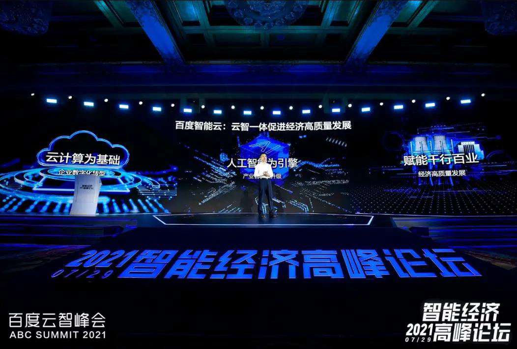 王海峰表示,“随着新一代信息技术的发展,以及数据的爆发式增长,产业开始应用智能技术,从海量数据中发现规律、提炼知识,促进产出增加和效率提升,实现企业生产经营的智能化,再到整个产业的智能化。因此,数字经济既包括数字化转型,也包括智能化升级,产业智能化是数字经济发展的新阶段。”基于百度的技术优势和对产业发展的洞察,经过跟合作伙伴的共同成长与产业实践,在本届智能经济高峰论坛上,王海峰宣布百度智能云的战略升级为,以“云计算为基础” 支撑企业数字化转型,以“人工智能为引擎”加速产业智能化升级,云智一体“赋能千行百业”,促进经济高质量发展。对于如何理解新战略,王海峰进一步做了解读,“云智一体的‘云’为数字化转型提供安全、稳定、灵活的数字化底座,‘智能化引擎’为智能化升级提供领先的创新技术和平台。”“我们推荐客户数字化转型与智能化升级一起做,一步到位,这样效率更高,效果更好”,王海峰说,“如果客户只做数字化转型,我们有丰富的云计算产品可以支持;或者客户已经有了数字化基础,我们的智能化引擎也可以助力智能化应用。”“以云为基础的数字化转型,以 AI 为引擎的智能化升级,云智一体,转型升级一步到位”,王海峰说。