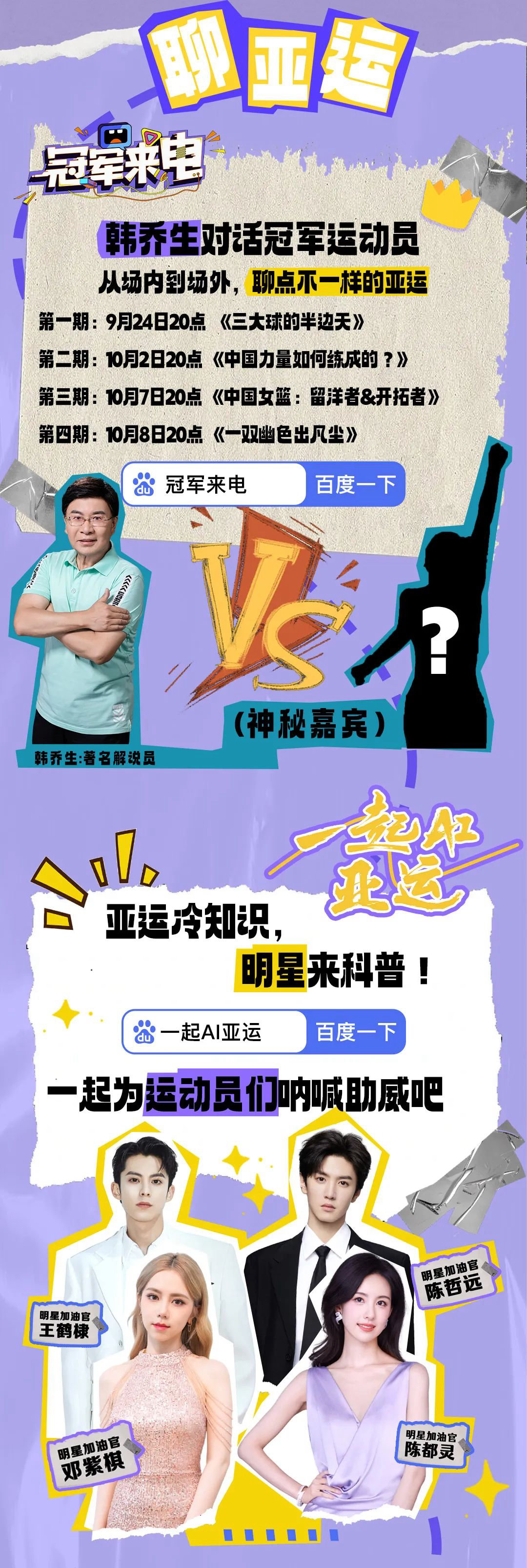 据悉,亚运期间,百度将上线《冠军来电》、《硬核赛场》等多个系列直播节目,紧跟亚运会全程,从赛事热点、赛事硬核知识,延伸至社会经济方方面面。