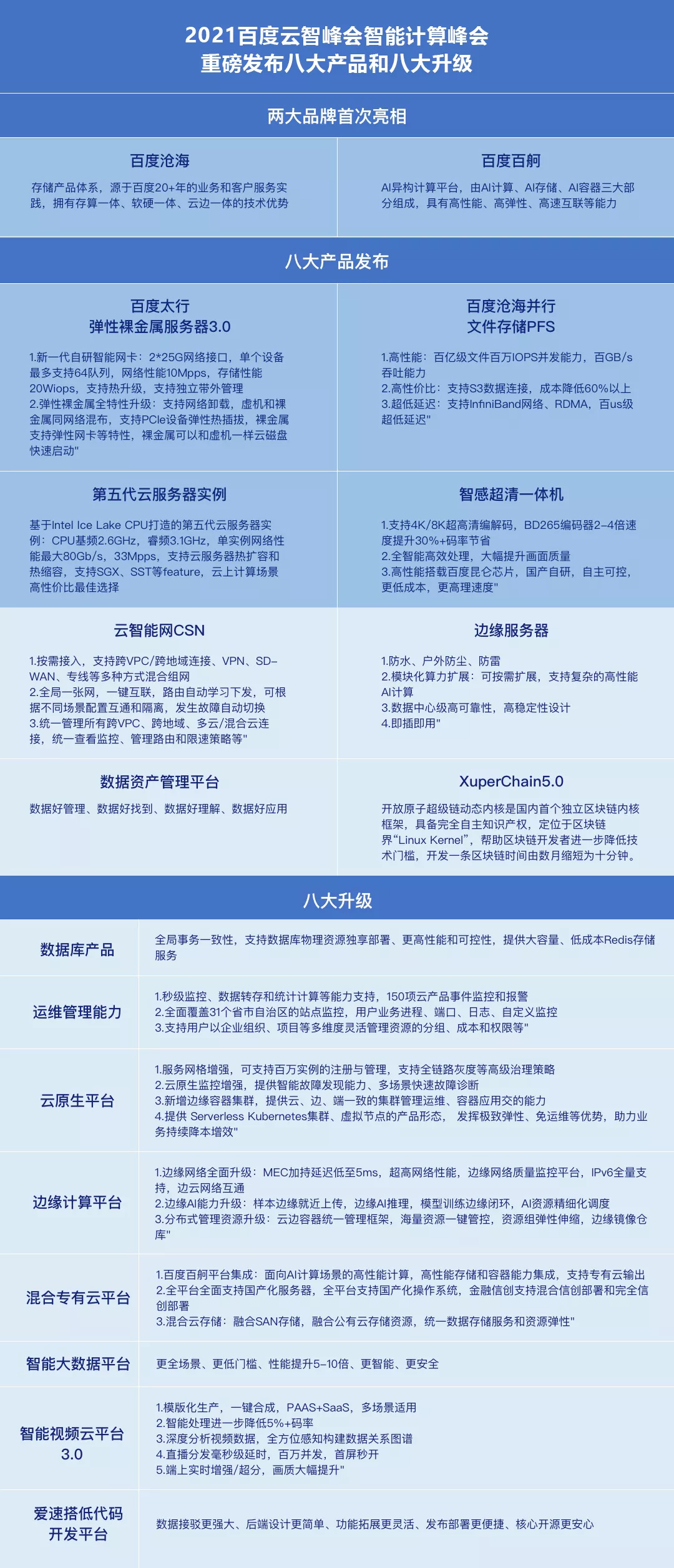 百度智能云还同时发布了八大新品,升级八大产品,全面升级 AI 基础设施,为企业带来高性能、高性价比的算力,数据处理、存储和分析更快速更高效,资源能耗更低,助力企业实现自主研发、自主创新。